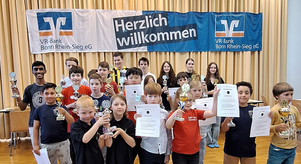 Mit 208 Kindern fand das überregionale Schachturnier der VR-Bank Bonn/Rhein-Sieg zum 100jährigen Bestehen des 1. SK Troisdorf 1924 am 8. Juni 2024 eine überragende Beteiligung. Die Teilnehmer im Alter von 5 bis 18 Jahren waren aus NRW, Hessen, Rheinland-Pfalz und dem Saarland angereist. Die Mehrzweckhalle FWH war gut gefüllt. 36 Kinder spielten in der Altersgruppe U8, 64 in U10, 44 in U12, 32 in U14 und 33 in U18. „Ihr alle seid Teilnehmer des größten Schachturniers, das je in Troisdorf stattgefunden hat!“ so der Vereinsvorsitzende Ewald Heck, der um 11 Uhr alle Teilnehmer und Gäste aufs herzlichste begrüßte.