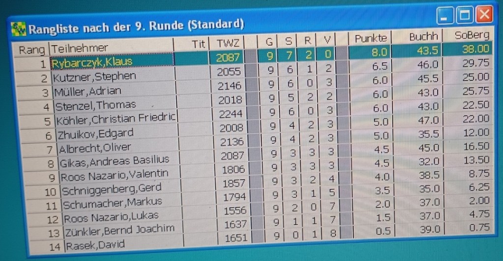 Klaus Rybarczyk vom Godesberger SK hat die SBRS-Blitz-Einzelmeisterschaft 2024/25 gewonnen. Bei dem am 17.1. in der Godesberger Stadthalle ausgetragenen Turnier mit 14 Teilnehmern und 9 Runden erzielte er 8.0 Punkte (7 Siege, 2 Remis) und lag damit in der Endtabelle klar vor der Konkurrenz. Um die drei weiteren Qualifikationsplätze für das Blitzturnier auf Verbandsebene wurde hart gekämpft. Stephen Kutzner (ebenfalls Godesberger SK) konnte sich in der Schlussrunde vom Verfolgerfeld absetzen und kam mit 6.5 Punkten auf Platz 2. Drei Spieler beendeten das Turnier mit 6.0 Punkten und mussten daraufhin – gemäß Reglement – in den Stichkampf um die Plätze 3 und 4. In einem spannenden Tie-Break setzte sich zuerst Adrian Müller (VdSF Bonn) mit 2/2 Punkten durch und belegte damit Rang 3. Vorjahressieger Christian Köhler vom Godesberger SK überwand schließlich seinen Vereinskollegen Thomas Stenzel und erreichte Endrang 4. Ein großer Dank gilt Sebastian Trunz, der kurzfristig als Turnierleiter eingesprungen ist. (ms)