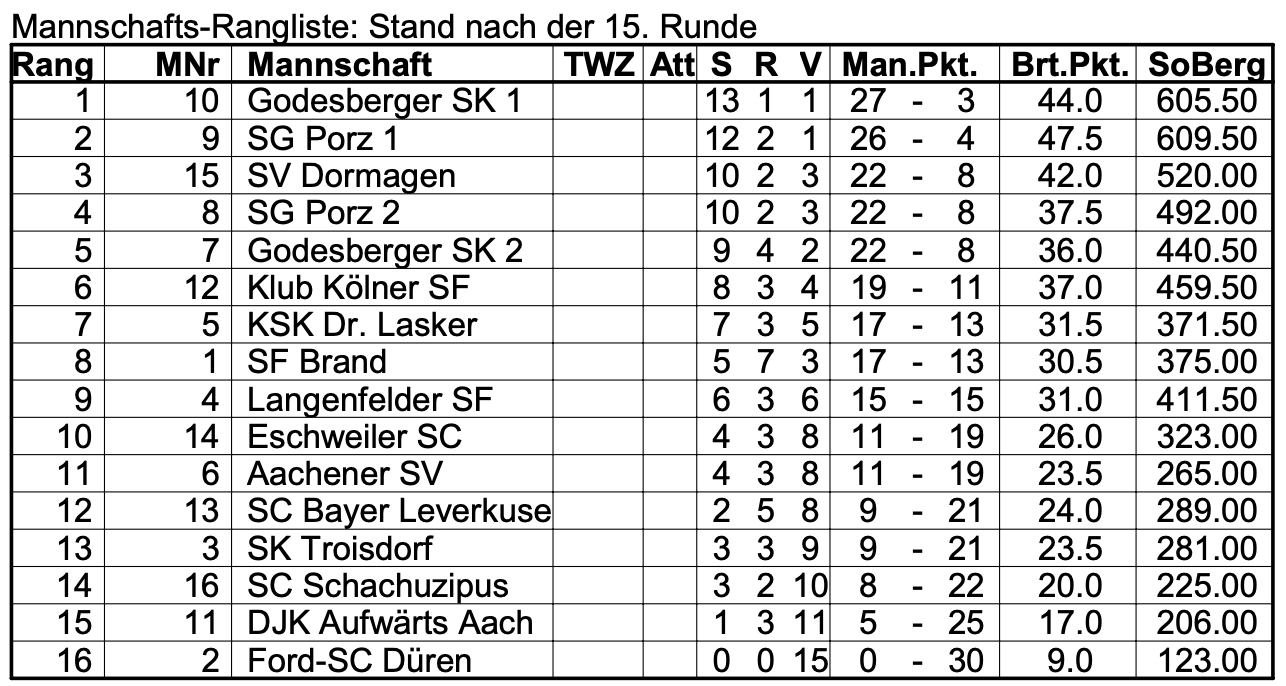 Die zweite Mannschaft der Godesberger kam mit 22:8 Mannschaftspunkten auf Rang 5. Das Team des SK Troisdorf erreichte mit 9:21 Punkten Platz 13. Aus den Einzelergebnissen ist hervorzuheben, dass Stephan Bröhl von GSK II mit 12.0 Punkten gegen starke Konkurrenz die Rangliste als bester Spieler an Brett 4 anführte.