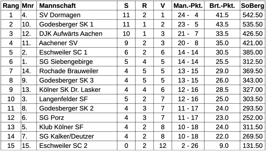 Der SV Dormagen, Godesberg, DJK Aufwärts Aachen und der viertplatzierte Aachener SV haben sich damit nun für die NRW-Blitz-Mannschaftsmeisterschaft qualifiziert, die am 8.6. stattfinden soll. Im letzten Jahr konnte die SG Solingen mit Spitzenbrett Loek van Wely dieses Turnier gewinnen. Zwei Teams aus NRW qualifizieren sich auf jeden Fall auch dieses Jahr für die Deutsche Blitz-Mannschaftsmeisterschaft. Titelträger des Vorjahres ist hier die SG Remagen-Sinzig. (ms)