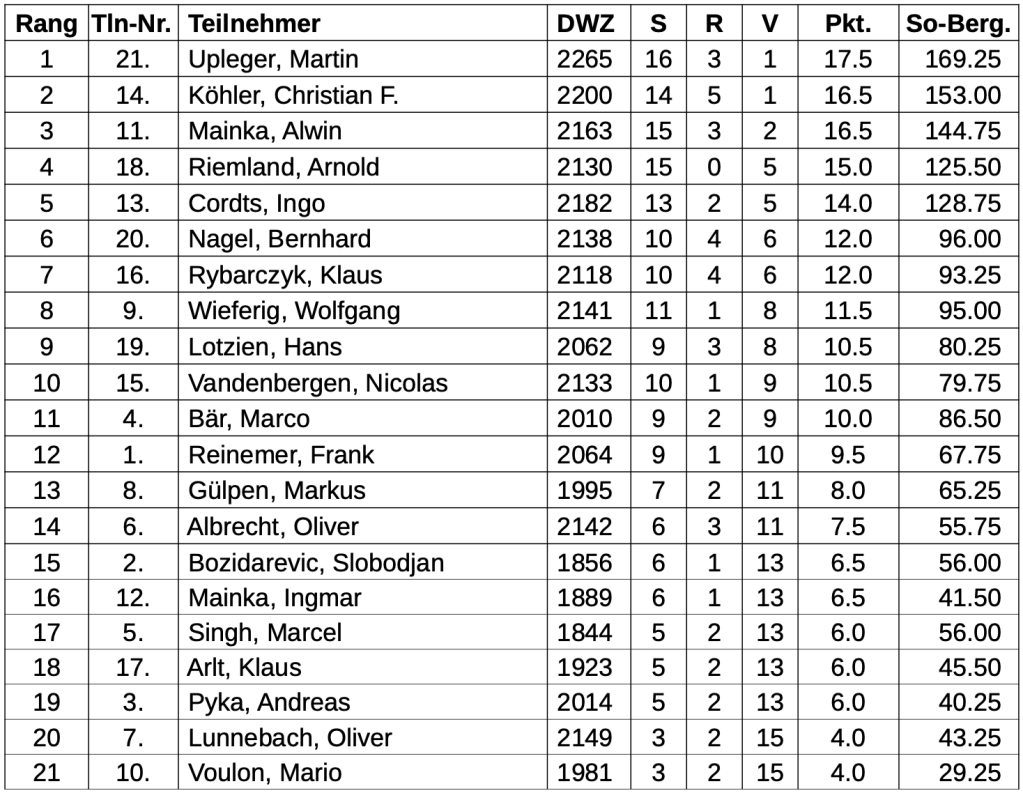 Martin Upleger von den Rheinbacher SF hat die Blitz-Einzelmeisterschaft 2023/24 im Schachverband Mittelrhein gewonnen. In dem am 2.3. beim SC „Schachuzipus“ in Köln-Mülheim ausgespielten Turnier erzielte er 17.5 Punkte aus 20 Runden (16 Siege, 3 Remis). Als Zweiter kam Christian Köhler vom Godesberger SK ins Ziel. Mit 16.5 Punkte (14 Siege, 5 Remis) lag er gleichauf, aber in der Zweitwertung vor Alwin Mainka (Arminia Eilendorf). Ebenfalls für die NRW-Blitz-Einzelmeisterschaft qualifizierte sich noch der Viertplatzierte Arnold Riemland von der SG Kalker/Deutzer.